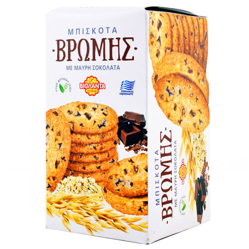 Απολαυστικό στρόγγυλο μπισκότο με βρώμη και μαύρη σοκολάτα, με υφή αφράτη χρώματος χρυσό-καφέ και άρωμα σοκολάτα.